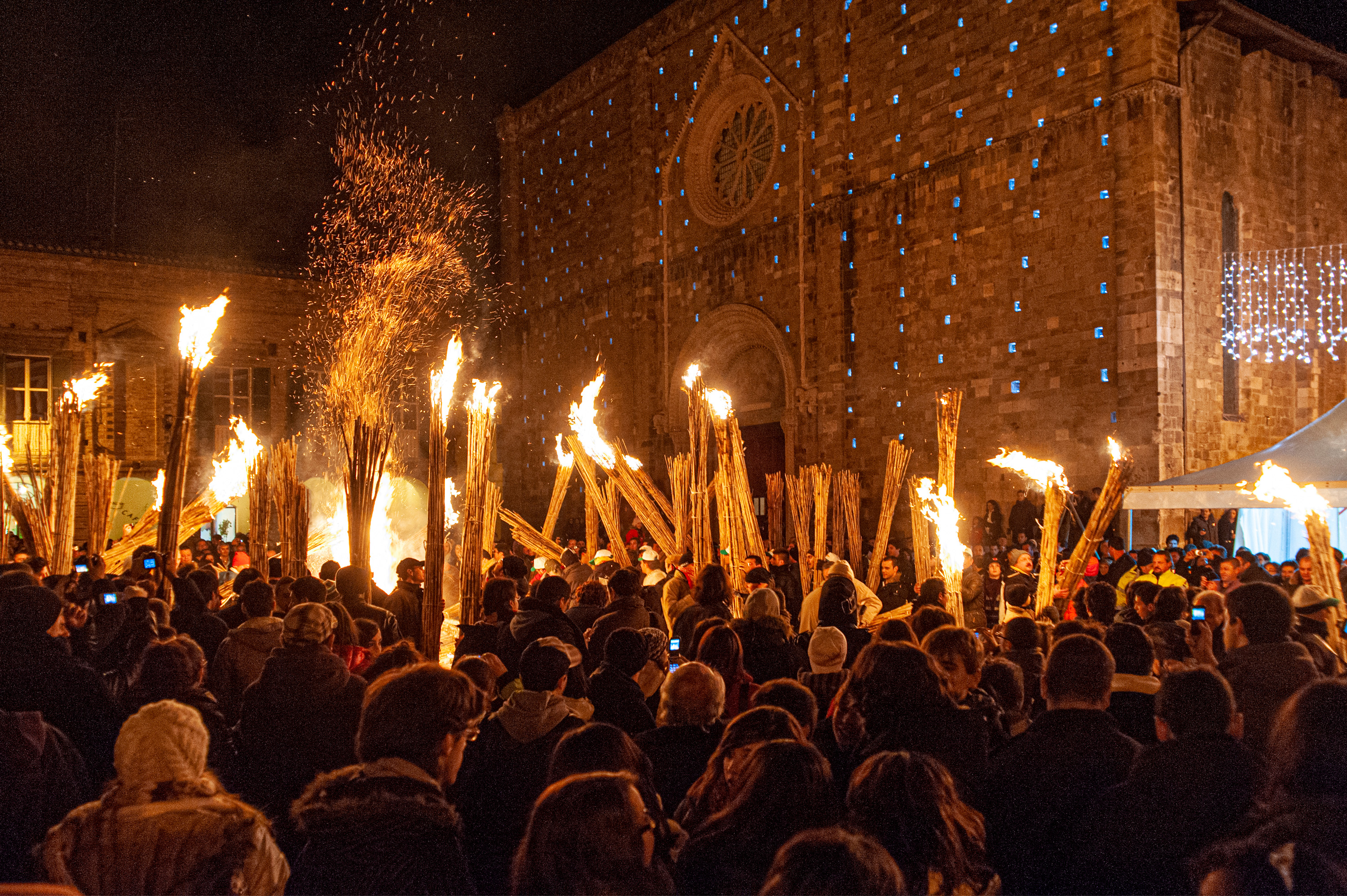 Alle cinque del mattino dell’8 dicembre, il “campanone” della cattedrale richiama tutti nella piazza: i presenti hanno con sé il proprio faugno che viene acceso utilizzando la fiamma del sacro fuoco. Subito dopo, accompagnata dalla banda, inizia la processione dei faugni, che attraversa l’intero paese per poi tornare nella piazza della cattedrale, dove i faugni vengono gettati nel falò centrale, e lasciati bruciare. Alle sei del mattino la celebrazione della messa nella chiesa di Sant’Agostino conclude la notte di festa.